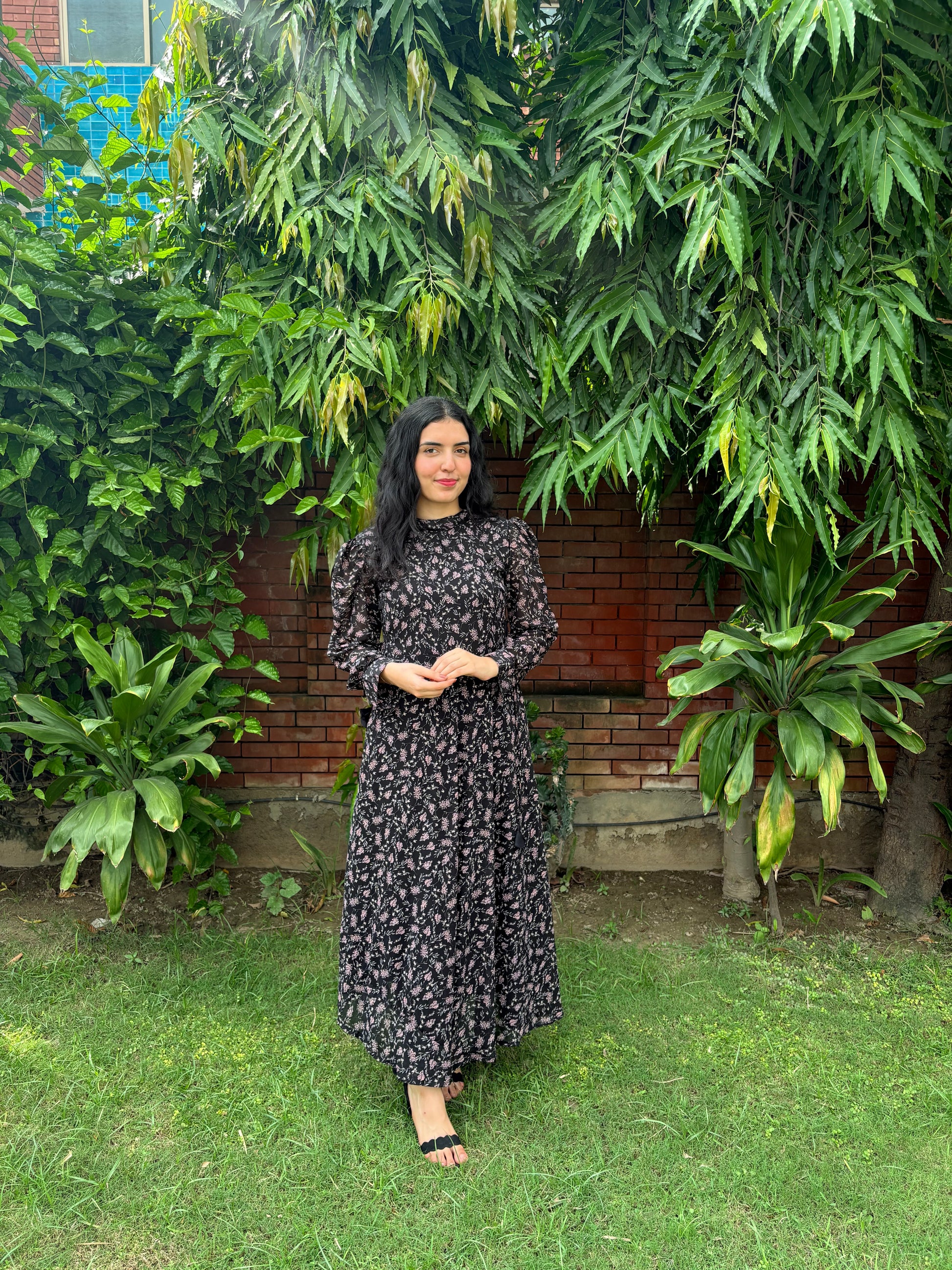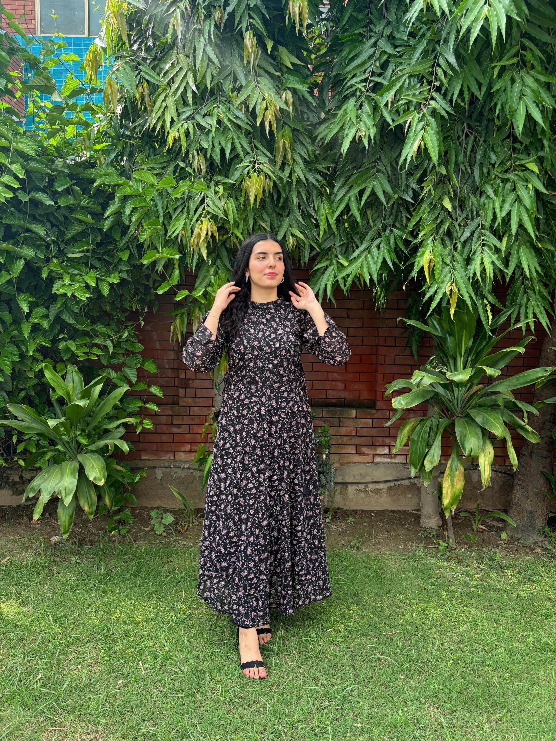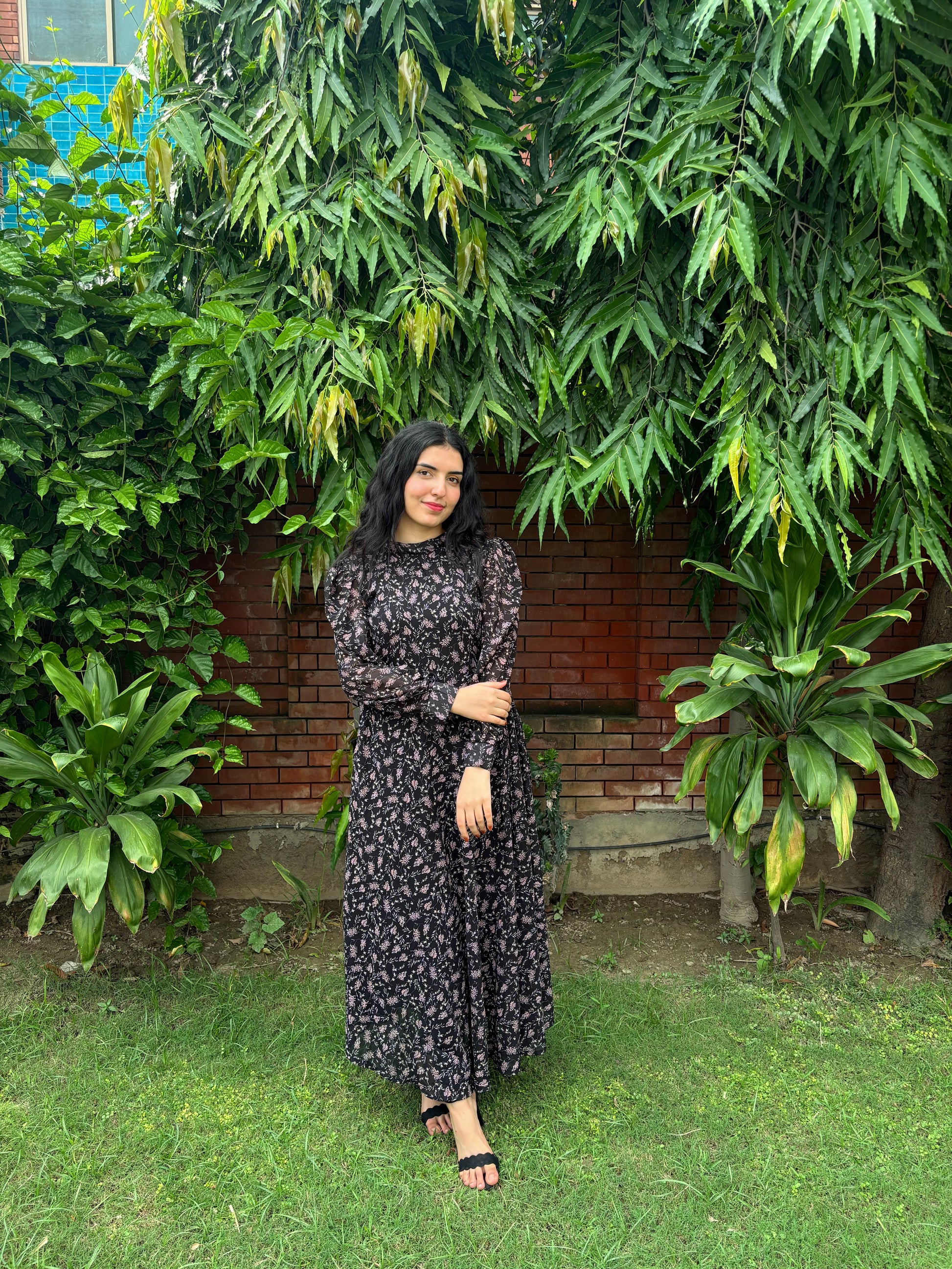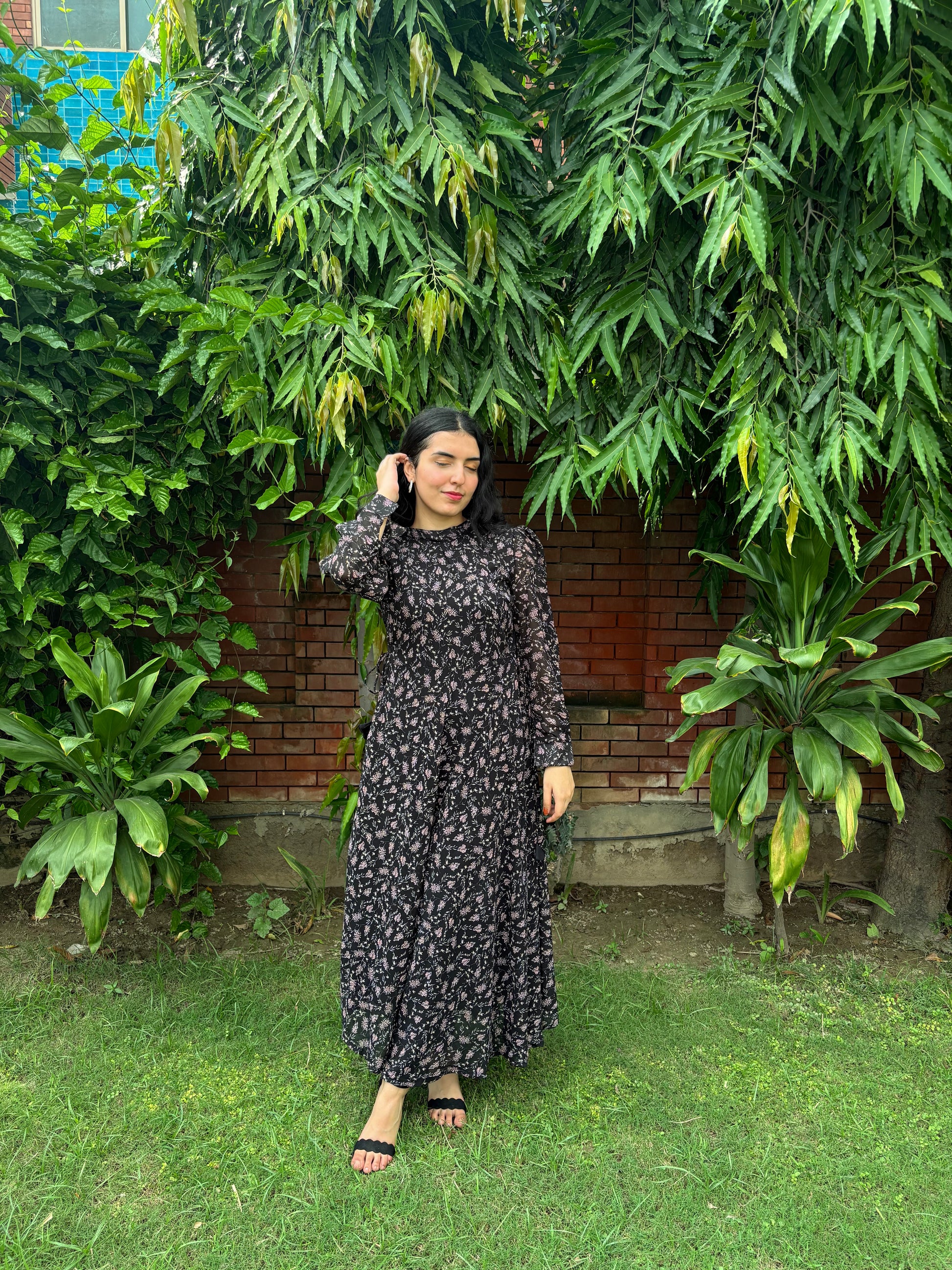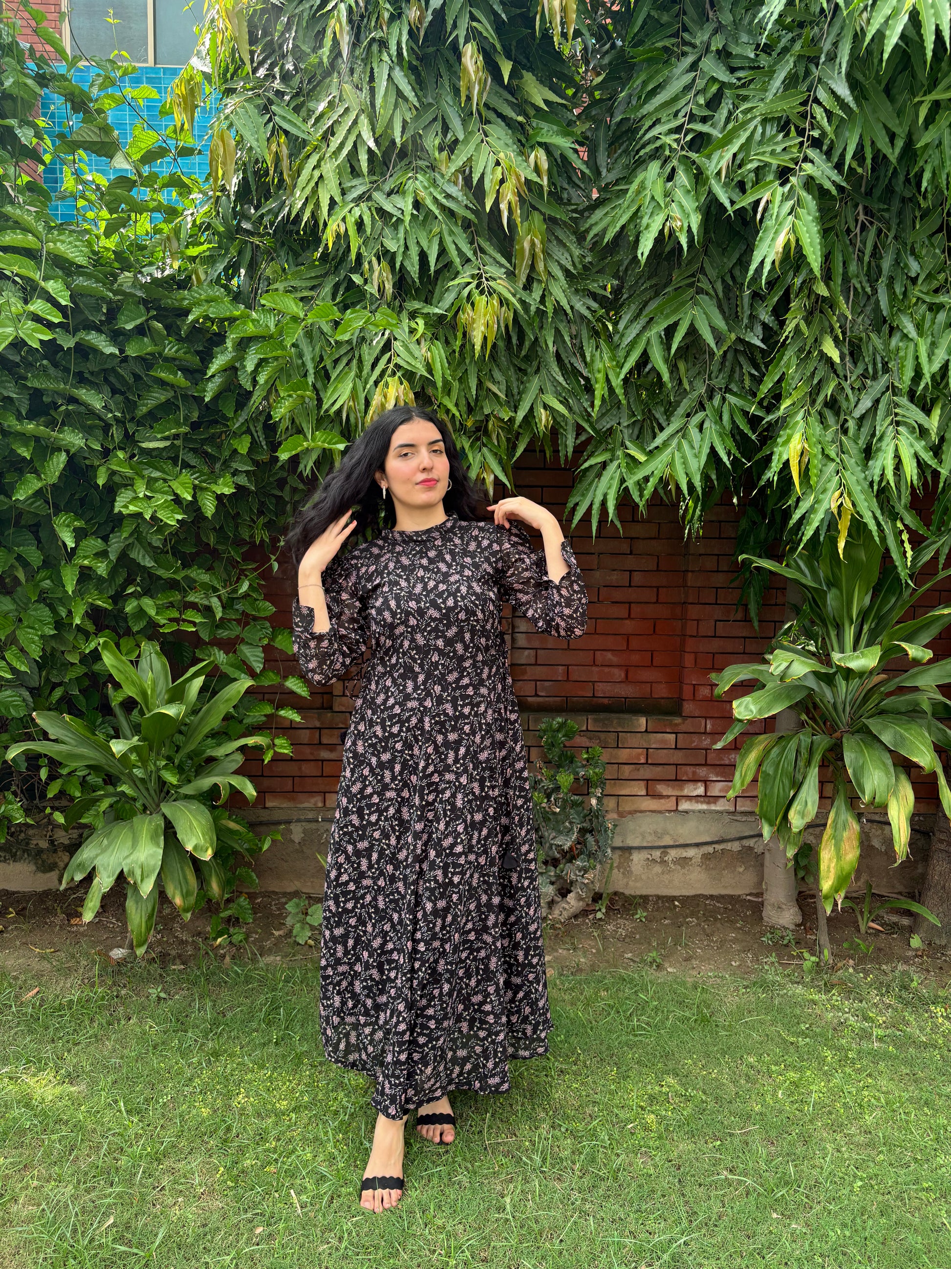 Black chiffon adorned with delicate florals, flowing with effortless elegance