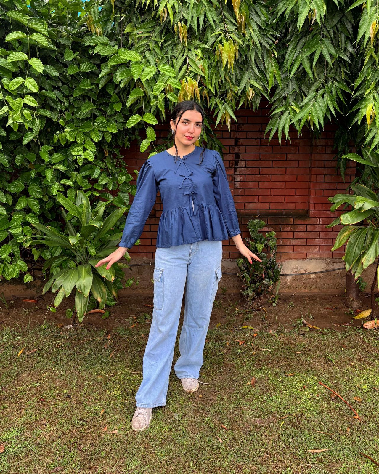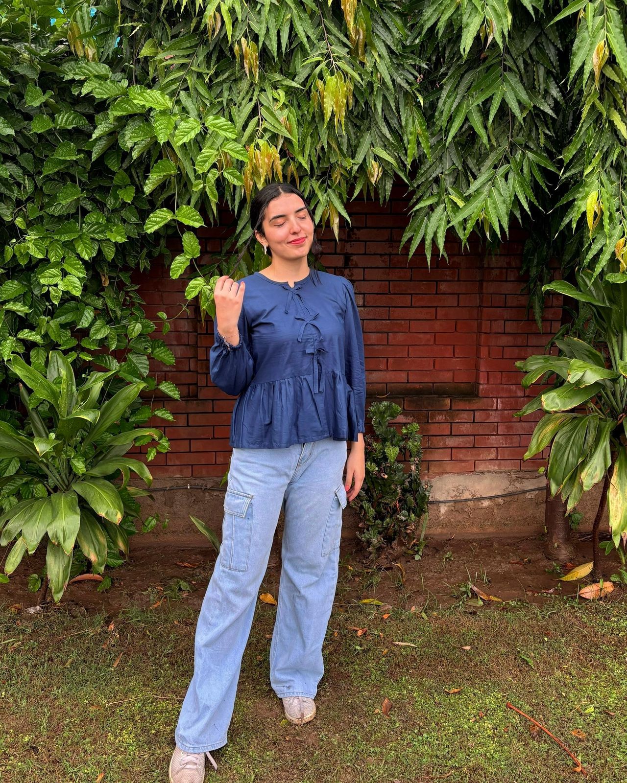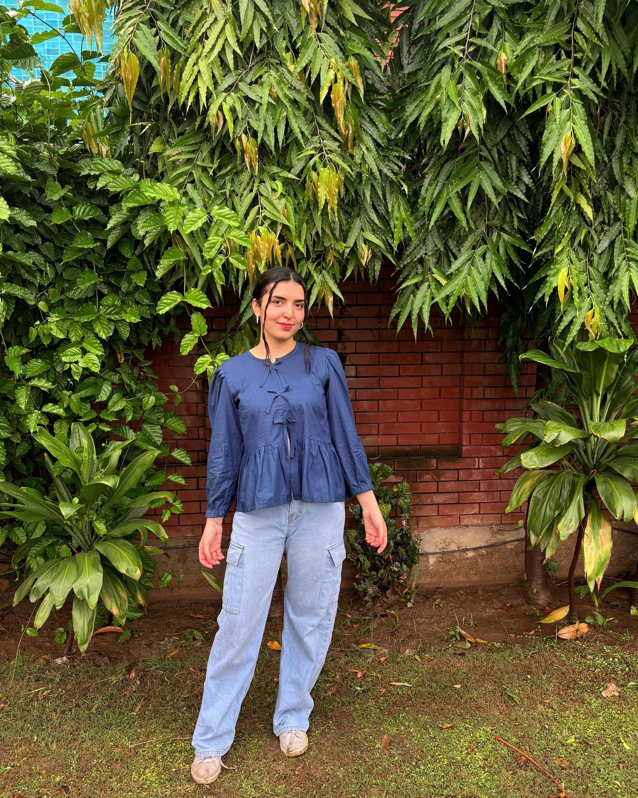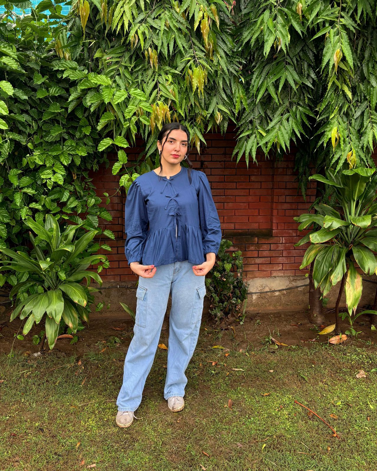 Blue bow-accent top paired with sleek jeans—versatile, chic, and effortlessly comfortable.
